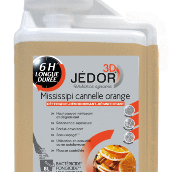 Jédor 3D parfum Mississippi cannelle orange est un nettoyant désodorisant désinfectant rémanent (la rémanence varie en fonction de la taille de la pièce, de la surface, de l’aération et du passage après nettoyage).
