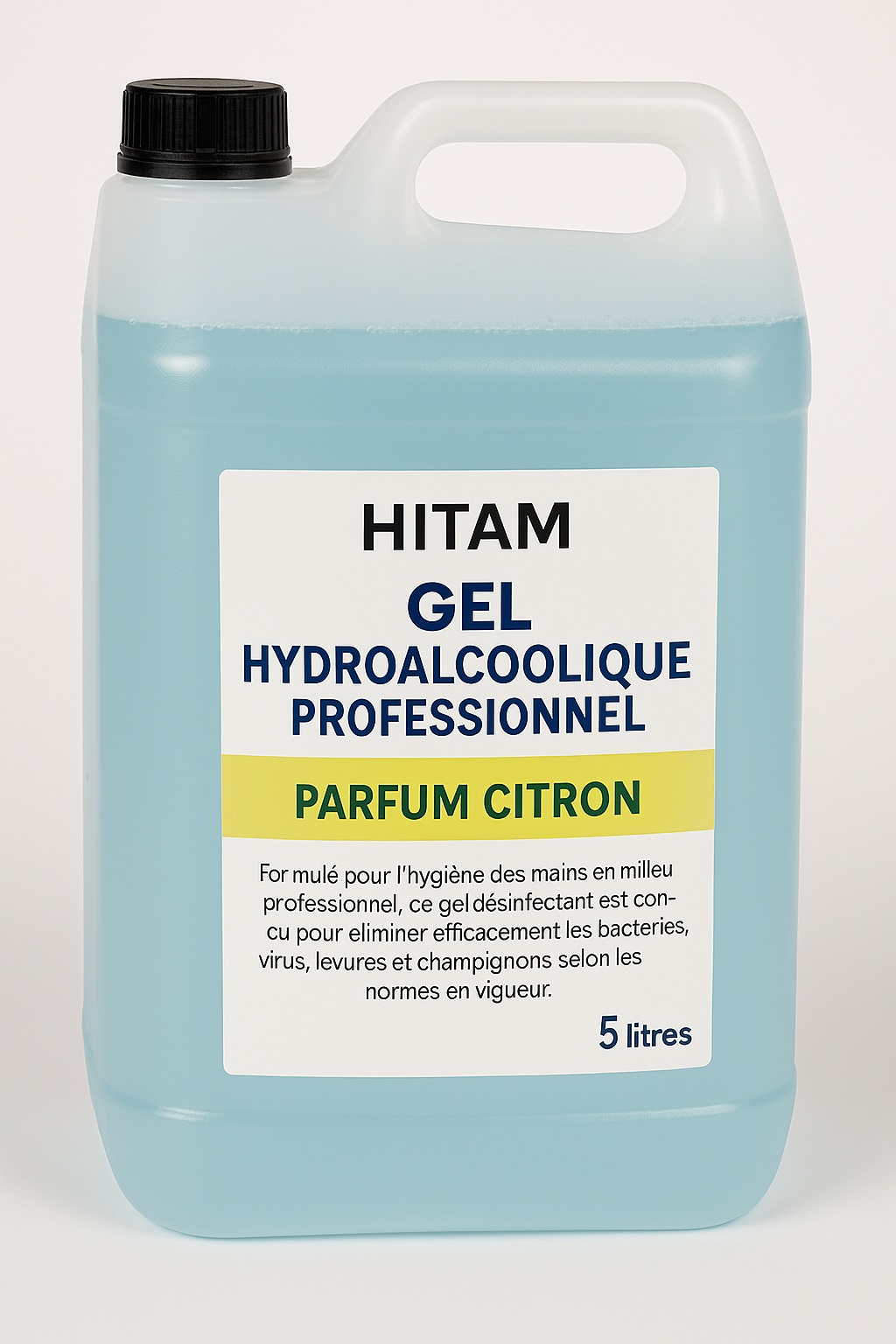 Gel hydroalcoolique professionnel HITAM parfum citron efficacité rapide, action désinfectante conforme aux normes, idéal pour recharger vos distributeurs et assurer une hygiène irréprochable en milieu professionnel.