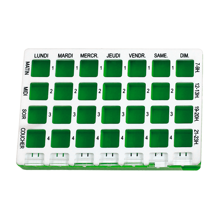 Le pilulier hebdomadaire est composé de 28 cases, soit 4 prises quotidiennes sur 7 jours, avec indication des 7 jours de la semaine et de « Matin – Midi – Soir – Nuit ». Les tirettes sont transparentes pour une bonne visualisation. Pour le remplissage hebdomadaire, le pilulier s’ouvre dans son intégralité.